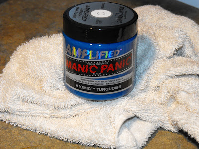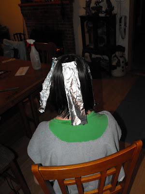 Once this color fades - it should only last about a month, the chunking will last longer, so we can try the blue again and since it won't take as long, may be able to get the real blue effect that she wants. Just in time for us to go to FL and freak out her Grampa when he sees his "little" granddaughter with BLUE hair!