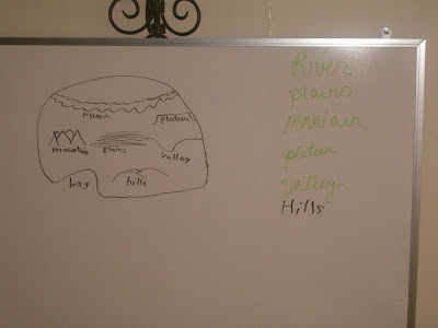 With CJ going over the road now, we are going to utilize his travels to reinforce our U.S. Geography! We are using a topographical map, that though it has cities, capitals, and a very light outline of the states, their aren't named on it. So KM uses our atlas to locate the town CJ is in and then locates surrounding towns to coordinate his location! Even when he is not here he can still be part of her education!