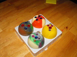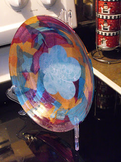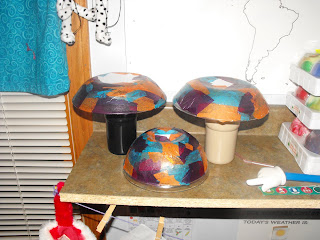 I had to play with the lighting and such and these pics really don't do them justice, but I think you get the idea. It gives them almost a stain glass like look. They can be used for centerpieces, fruit bowls, candle holders or whatever. You can also do this on other glass surfaces or to cover up something else. KM has now been stockpiling things that she wants to decoupage for gifts!