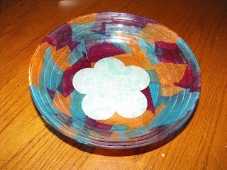 I LOVE, LOVE, LOVE Modge Podge! KM does now too! We got some plain glass bowls from the dollar store, added some Modge Podge and tissue paper and here are the results -