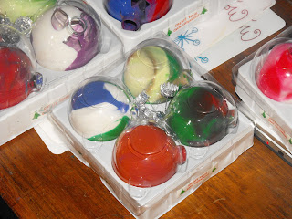 At our co-op holiday party the kids made these great ornaments with plain glass ornaments and acrylic paint. KM immediately wanted to make them for all her grandparents and aunts. We all had fun doing this one.