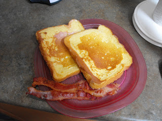 Since I was trying to get her back to awaking before noon, I coaxed her out of bed with some french toast and bacon - HER FAVORITE!